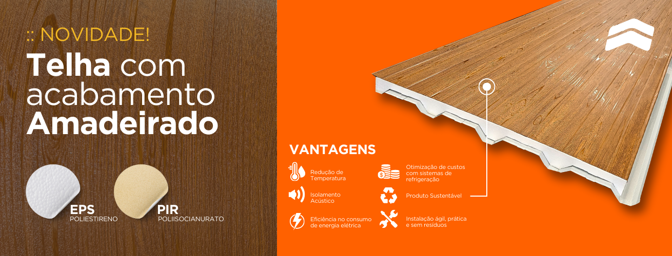 Além da estética diferenciada, a telha é fabricada com núcleo termoacústico, disponível nas versões EPS (Poliestireno) ou PIR (Poliisocianurato), garantindo mais conforto e economia para sua obra.